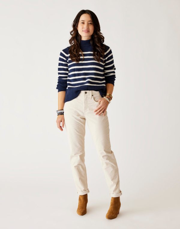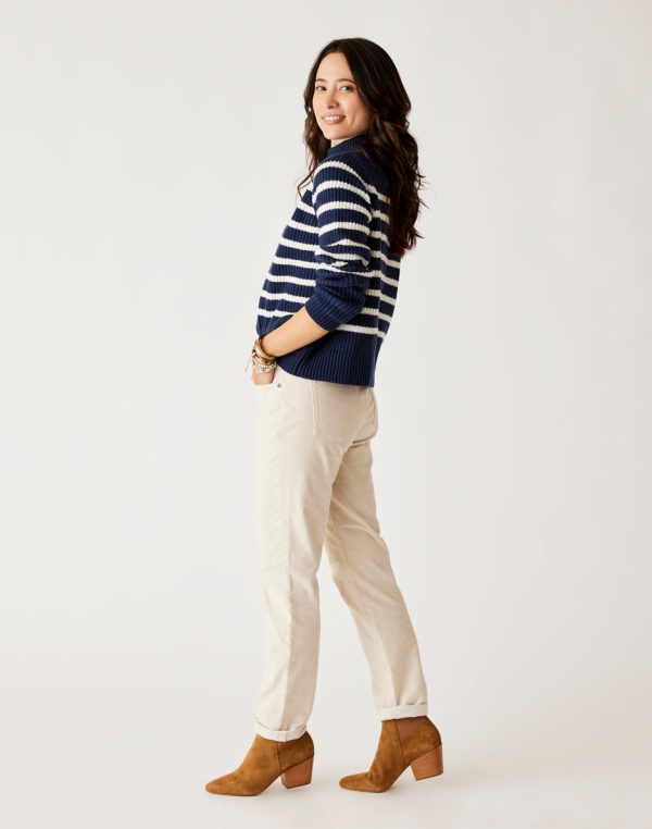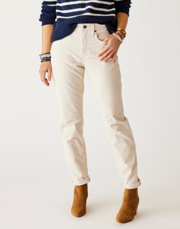 Styling casual comfort with the same relaxed fit as the popular Carson Cord, but more snug around the waist. High rise waist, zip fly with button closure and cuff detail with raw hem give these pants some claims for fame.